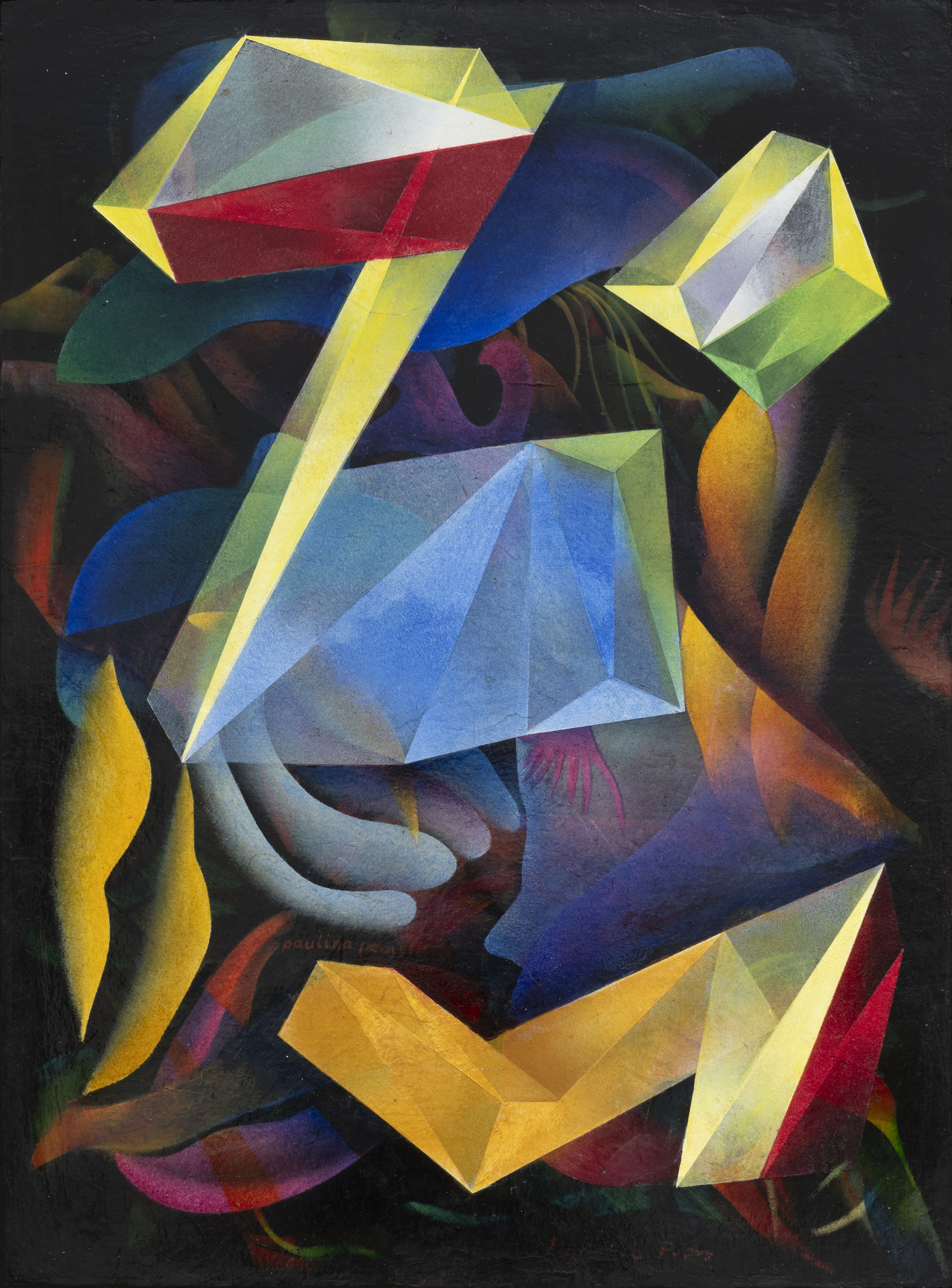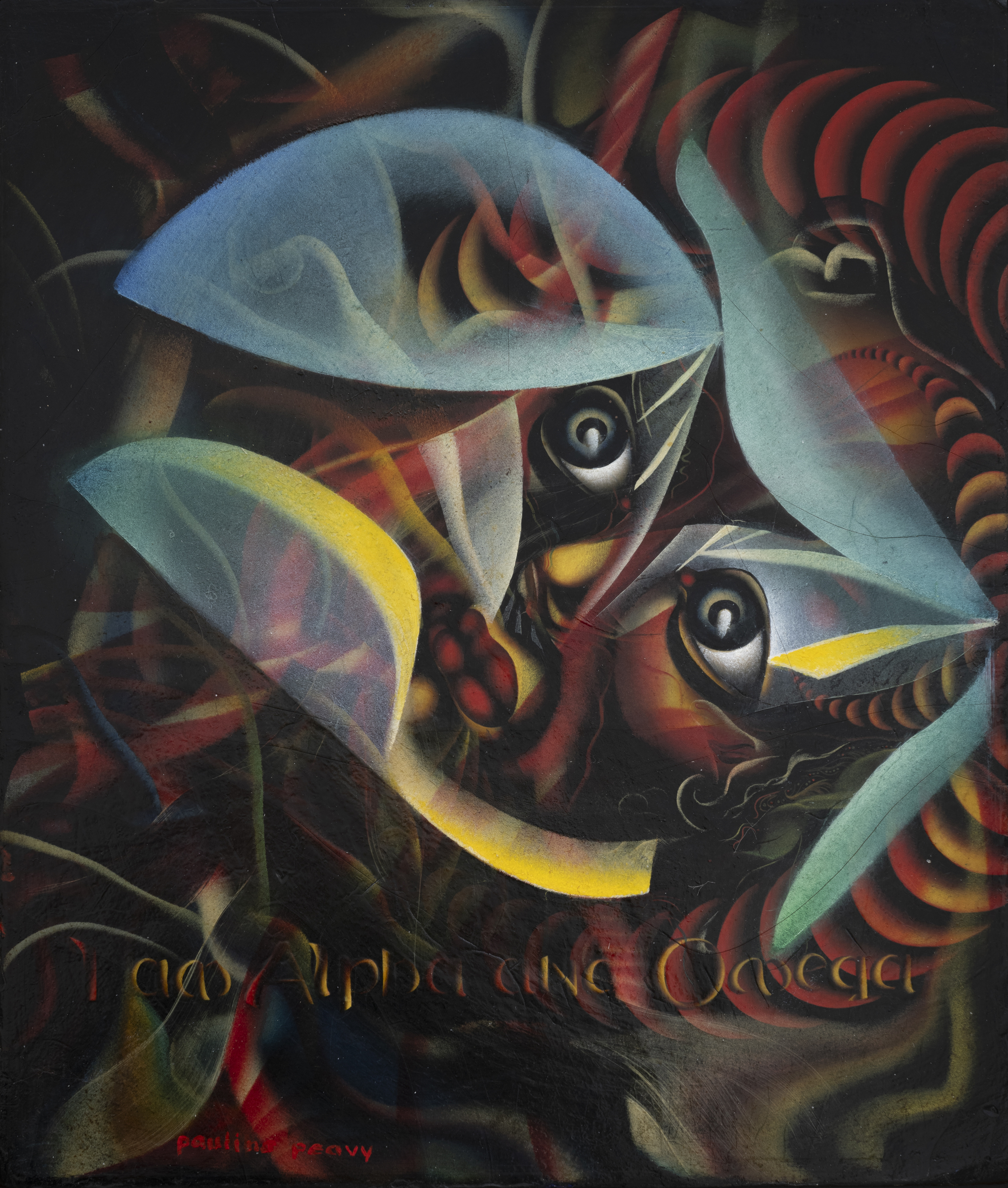 In 1932, Peavy attended a séance at the home of Ida L. Ewing in Santa Ana, Califor-nia, where she claims to have met a spirit/UFO from another world named Lacamo. From that moment forward, Peavy, a university-trained artist, painted with a brush that “moved on its own.” Peavy’s artistic path centered around her convening with beings and forces beyond the visible plane to create her work.
