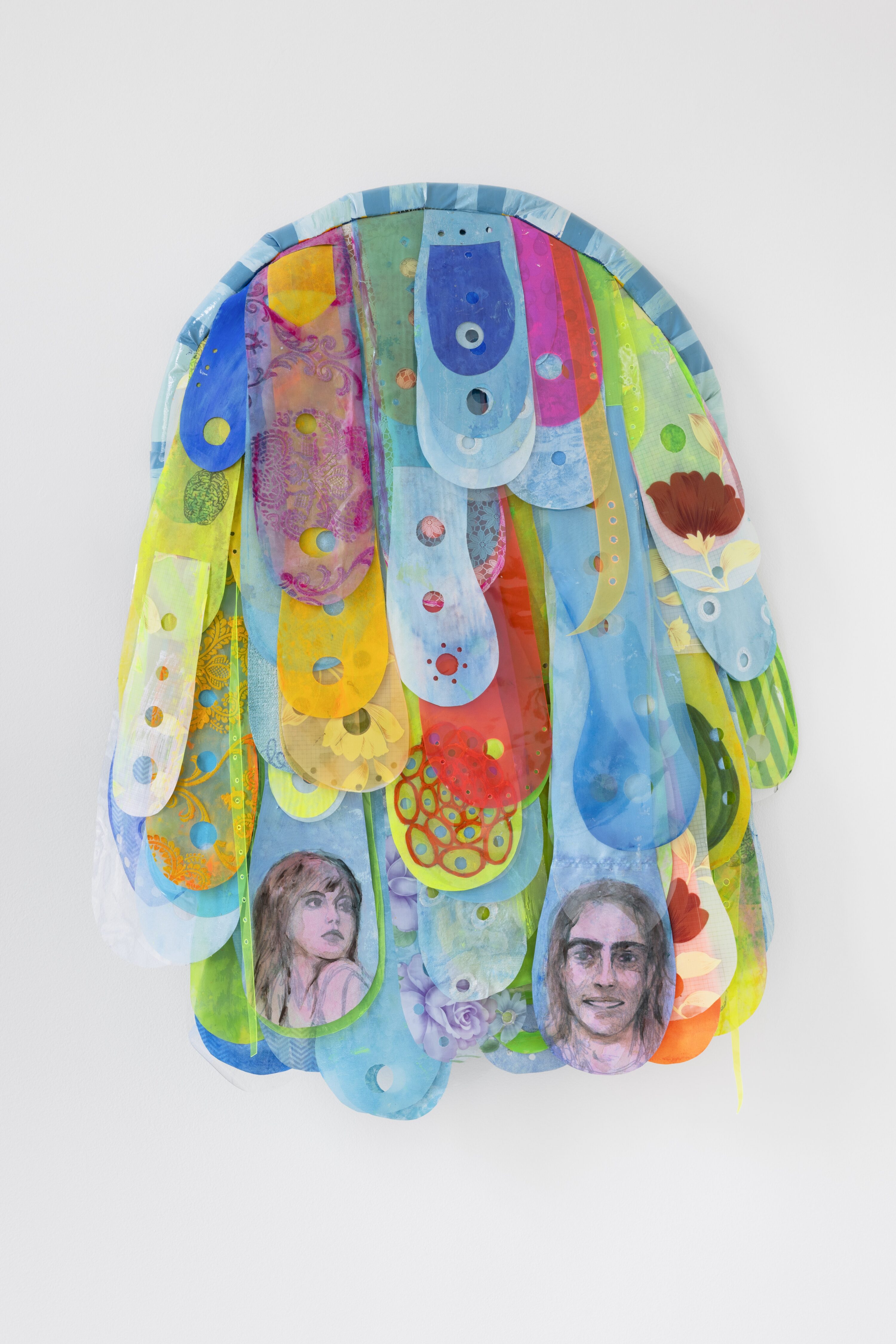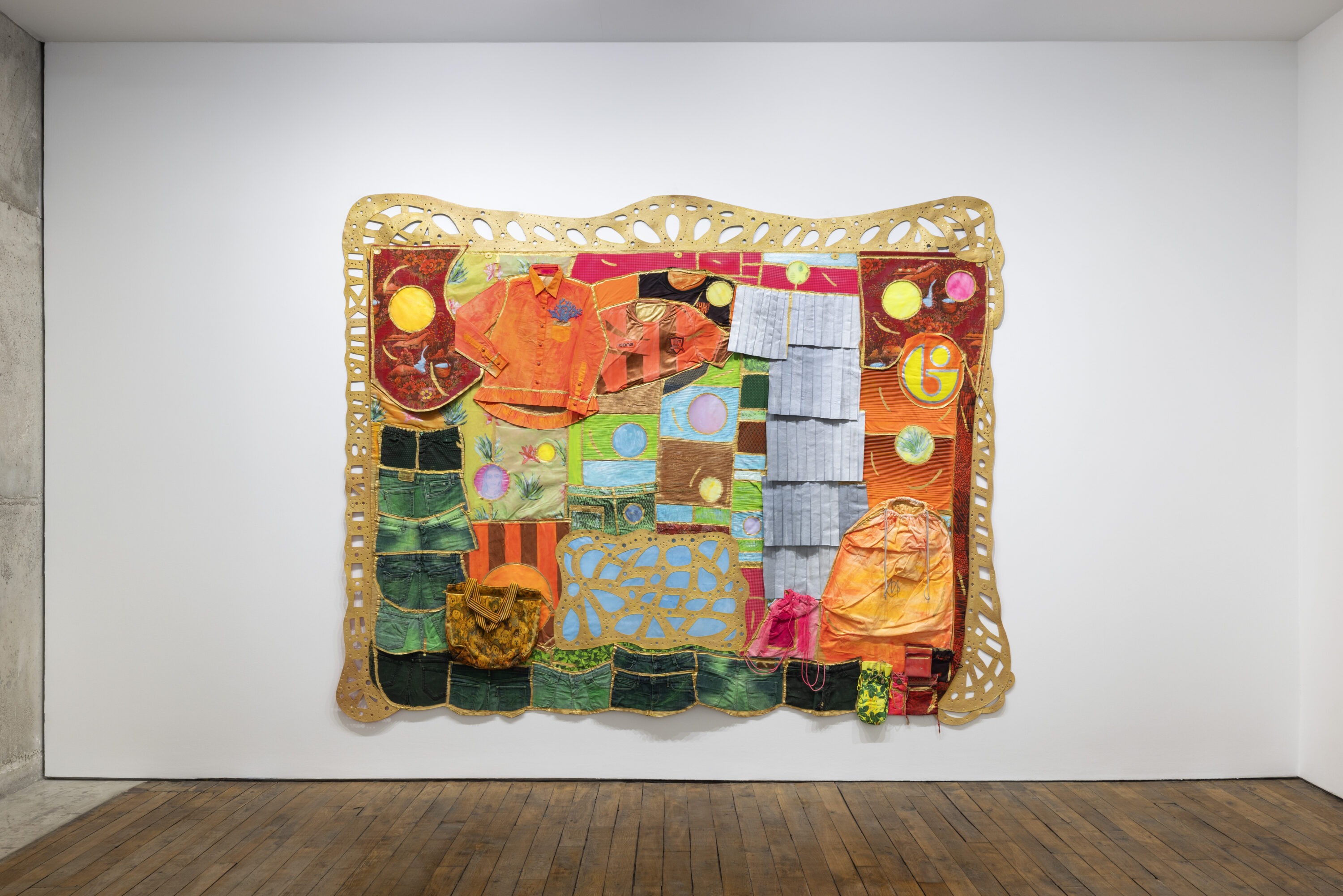 In Favorita, Catunda engages with personal taste as a performative and affective category. The work of the same name, installed on the ground floor, features a series of clustered motifs, including geometric shapes and real apparel charged with emotional investment - a row of skirts, teamwear, bags and of course, jeans. The latter’s brand, cut, wash, and even how they are worn can relate to a particular tribe, while their signs of wear can become emotional traces, imprinted with the body’s shape and sometimes associated with particular memories. Catunda acknowledges the standardization of desires but resists cynical readings of popular taste as mere alienation; she approaches it instead as a sincere and heart-felt search for identity. In the work, the motif in the top right is not circumstantial - the Fundação Bienal de São Paulo logo, designed by Aloisio Magalhães in 1965, is a way of addressing the art institution existing in the middle of a field of visual exuberance.