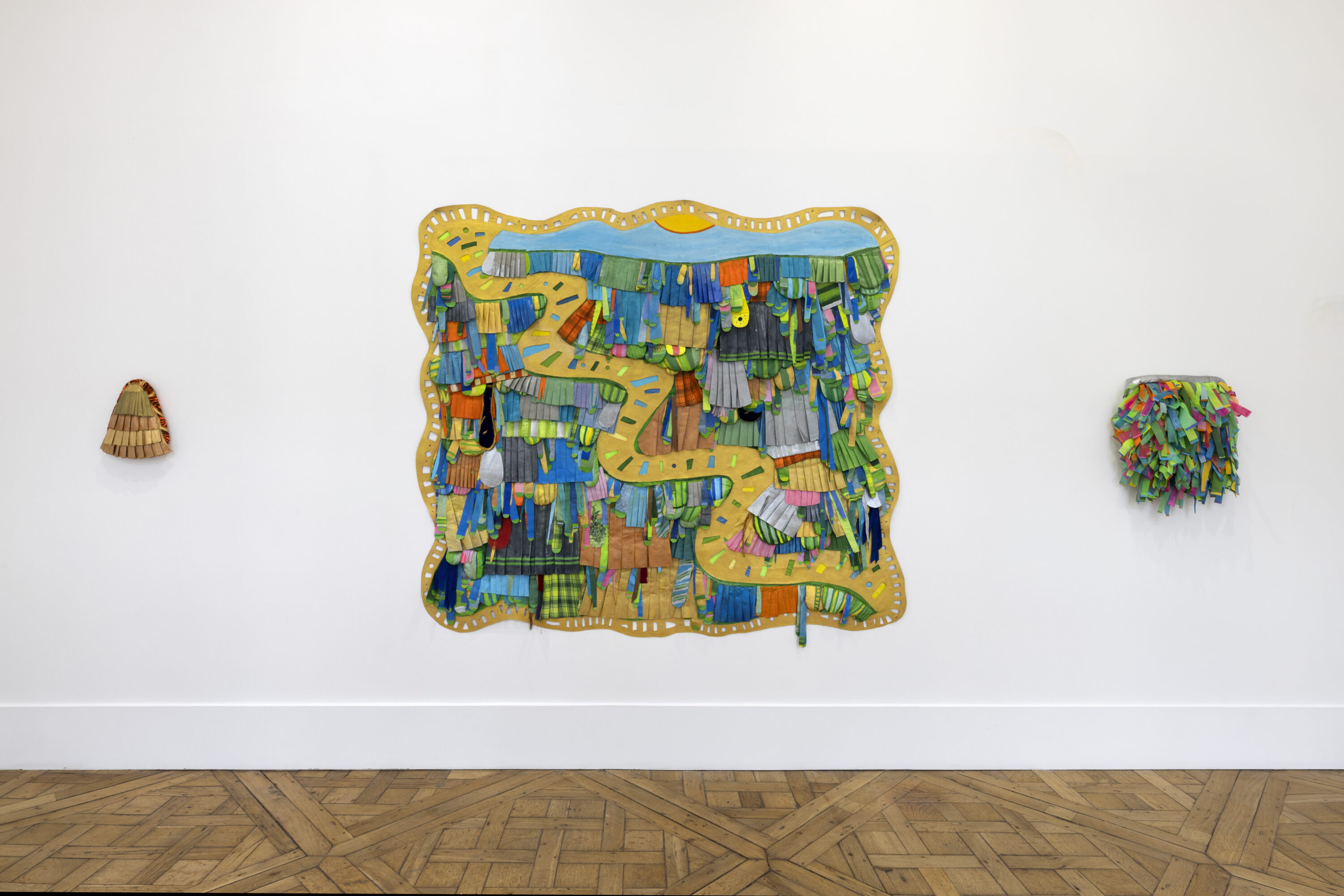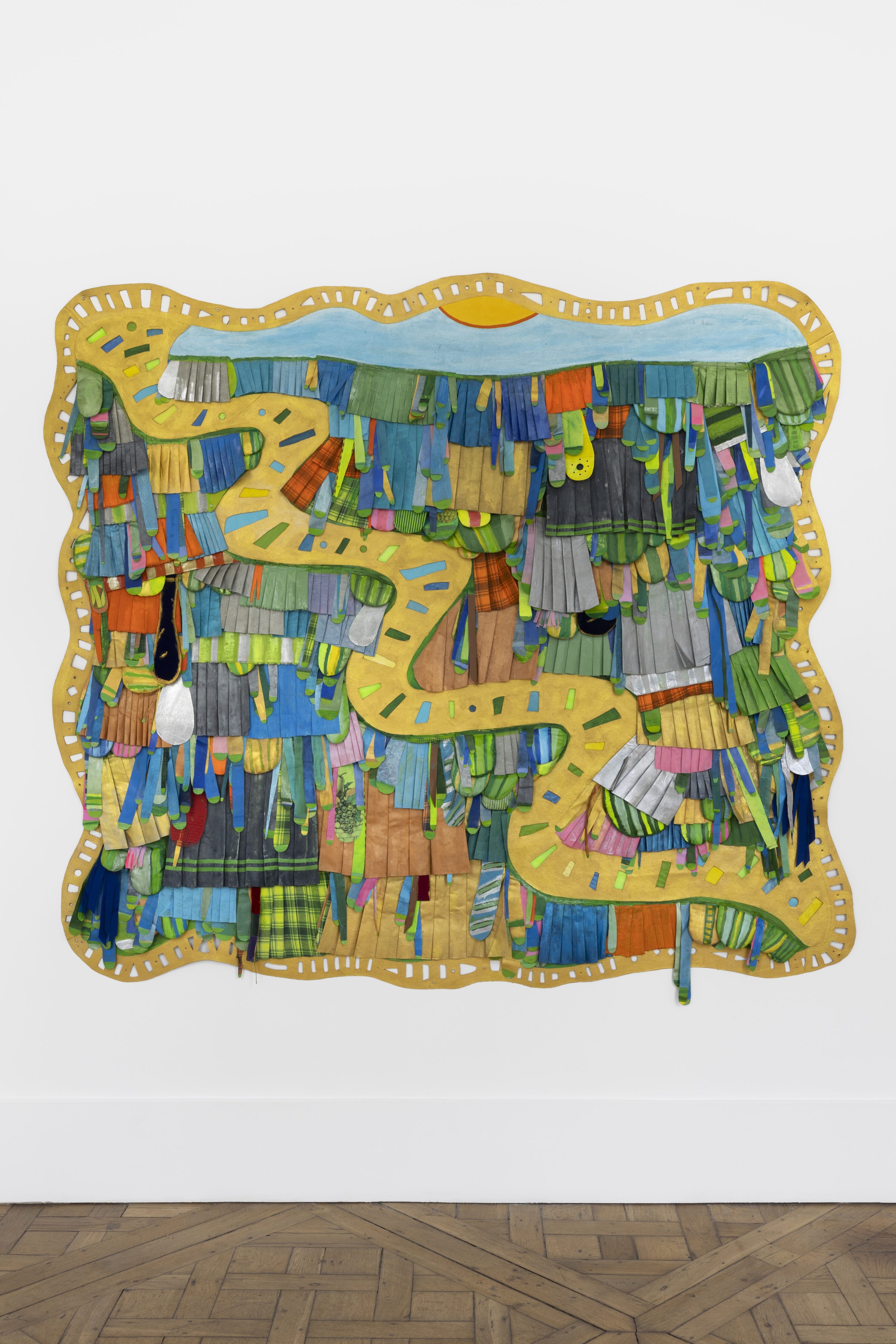 In her topographical paintings, a series of personal geographies integrate the exuberance of both the natural and the artificial. Caminho com saias (Path with skirts), 2025 is a composition of mainly pleated drapes (echoing the skirt as a marker of feminity) but also prominent protuberances and her signature unfolding flaps. Her use of gold edges and trails echoes the colonial fantasy of El Dorado - a golden land invented by European imagination, which justified extraction and conquest in the Americas. In her other, significantly smaller padded landscapes, such as Bomba (2024) and Paisagem com Garota (2025) Catunda pushes further the relationship between landscape imagery and geometry, given sometimes by the preexisting pattern of found fabrics. Catunda’s sewn compositions engage equally with both the iconographic value of the images themselves and the textures, folds, and physicality of her carefully chosen materials.
