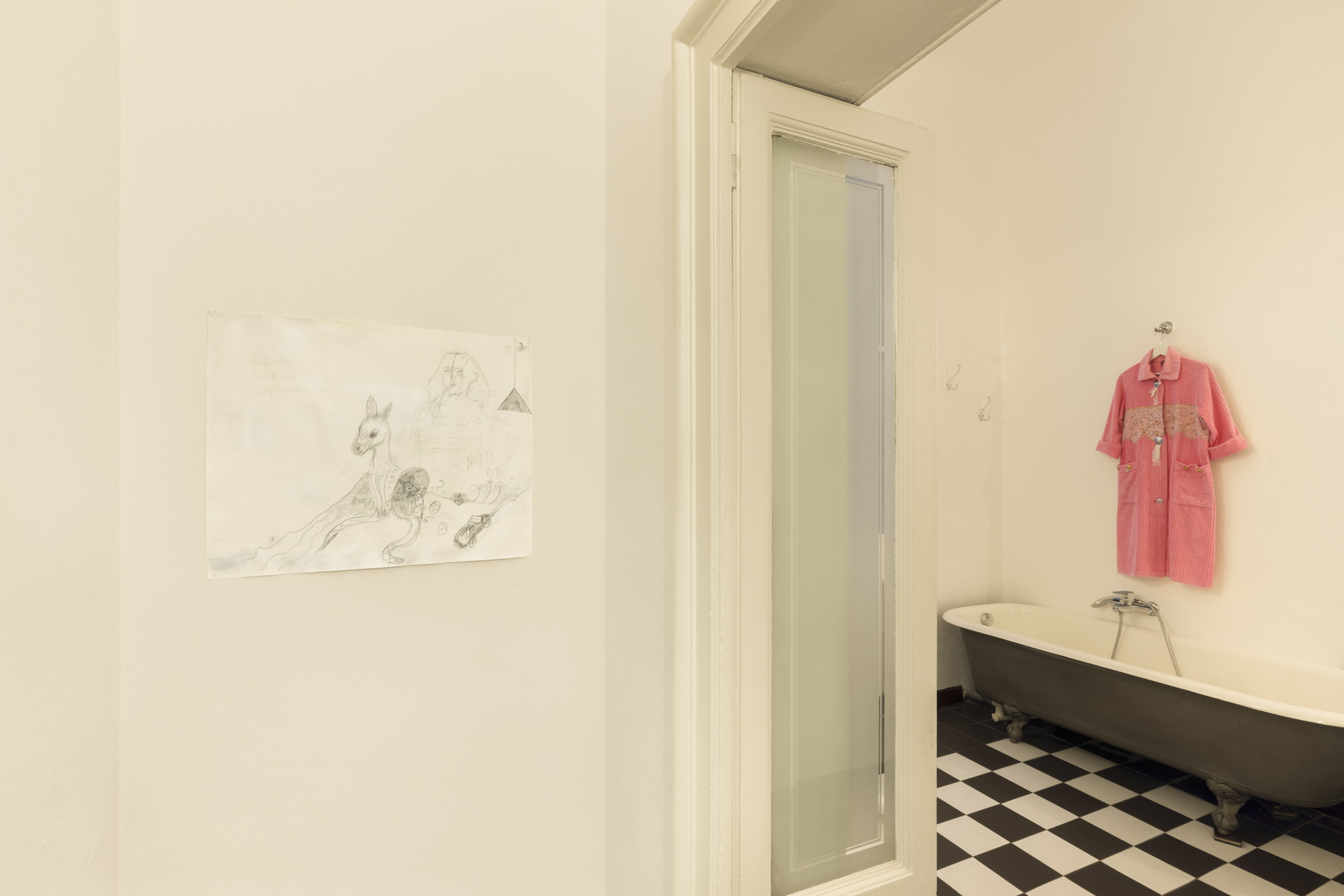 Throughout the apartment’s three rooms and bathroom, Sundblad stages a sequence of works that suggest the lingering presence of a woman who may have once lived here—or may still be inhabiting the space in a suspended, half-imagined form. A nightgown from circa 1975, made by the iconic Swedish fabric company Almedahls (once owned by Sundblad’s family) and reworked by designer Rafaella in 2025, appears almost to occupy the room, placed on a life-size mannequin; together with additional garments, it establishes the exhibition’s quietly inhabited atmosphere. Their terry-cloth textures, combined with the grey-green carpet underfoot, conjure a 1970s vocabulary of house-wear: garments that sit somewhere between bathrobes and dresses, blending comfort with a latent performativity. A single flower painting (Untitled, 41 x 33 cm) from 2020 introduces a note of melancholy, an anchor to the emotional register that runs through the exhibition.