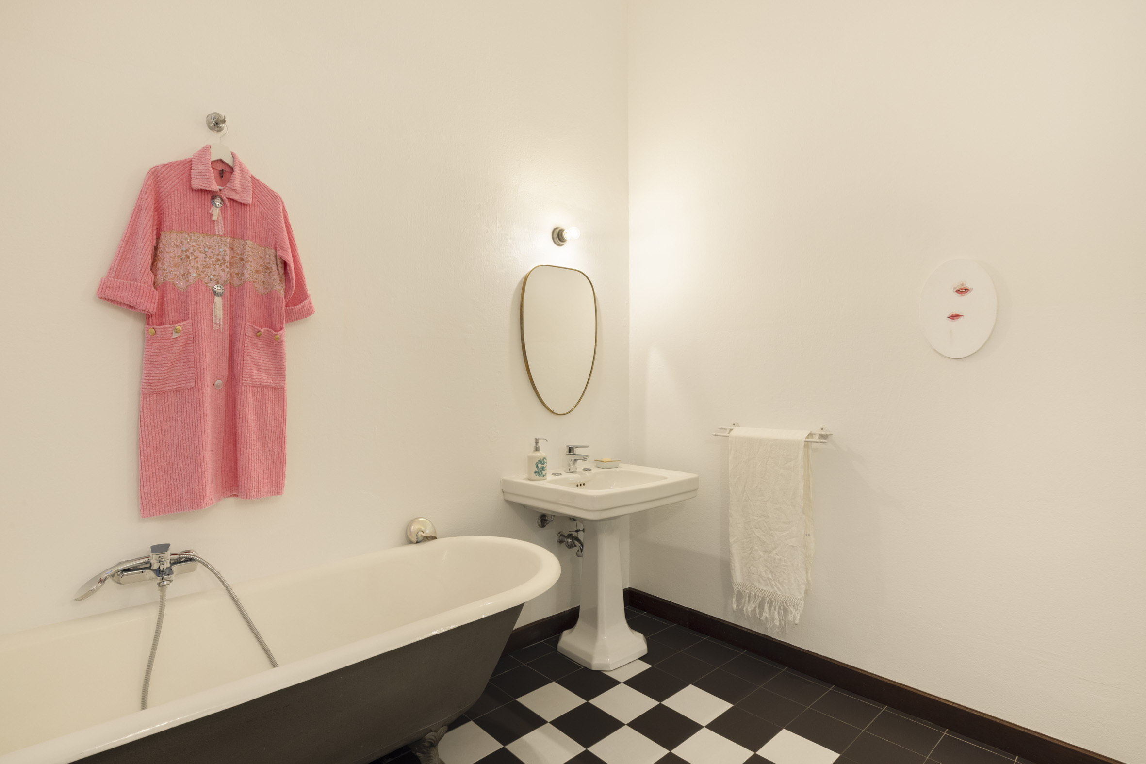 The bathroom becomes a stage of its own, animated by a pink robe dating from approximately 1959 and reworked by Rafaella in 2025. It hangs close by—almost a bathrobe, almost an outdoor coat—its surface marked with glitter, rhinestones, and flashes of gold and silver that appear throughout the exhibition. A small oval painting of two red lips (35 x 28 cm), functioning as a mirror without a face, seems to reflect the apartment more than the viewer, as though the space itself were speaking to the absent inhabitant whose traces animate these rooms.