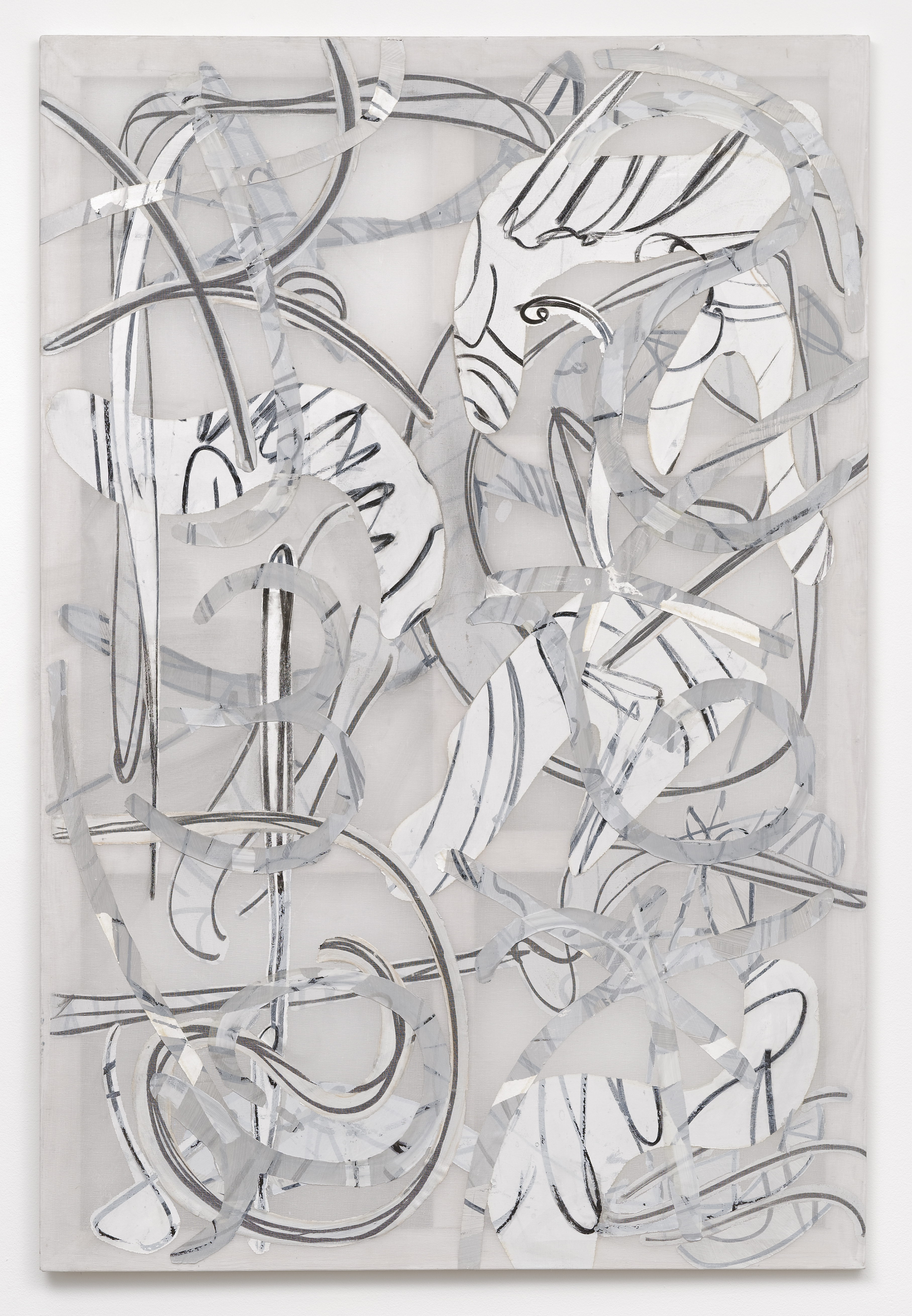 The use of tarlatan, associated with glue, makes visible here the in-between of the support and the surface. It brings together the data that allows, in the artist's words, "the division of the division", i.e. the division of the plane into thickness. For each Babel, Bonnefoi puts himself in the position of not being able to completely direct the image he is going to produce. This "shedding of visual control" is fundamental to his practice, for what becomes a figure must not be the direct trace of the painter's gesture.