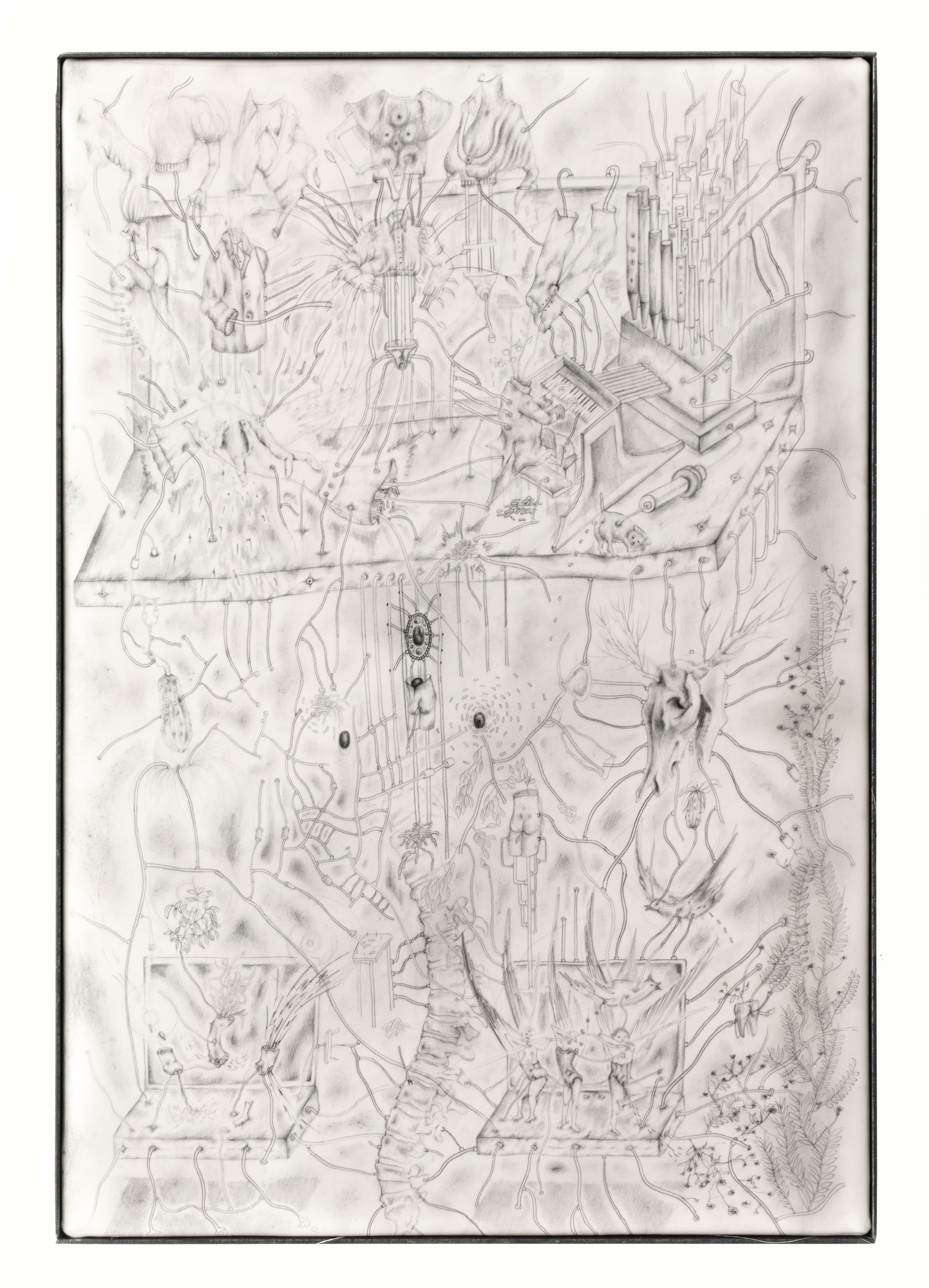 EnquireThe works on silk are inhabited by a multiplicity of unicellular organisms, humans, animals, saints, and visceral parasites all interconnected by biomechanical pipes that pass through their orifices to form a single living system. The drawings are freely executed by the artist directly on silk, mounted on cotton and framed in a handmade steel frame which give them a sculptural quality. When they are not absorbed in some kind of reflection, Benni Bosetto's characters are grappling with a series of ritual gestures and self-care exercises. The body reveals itself here as the origin of perception, the source of material knowledge and the holder of an intergenerational memory.