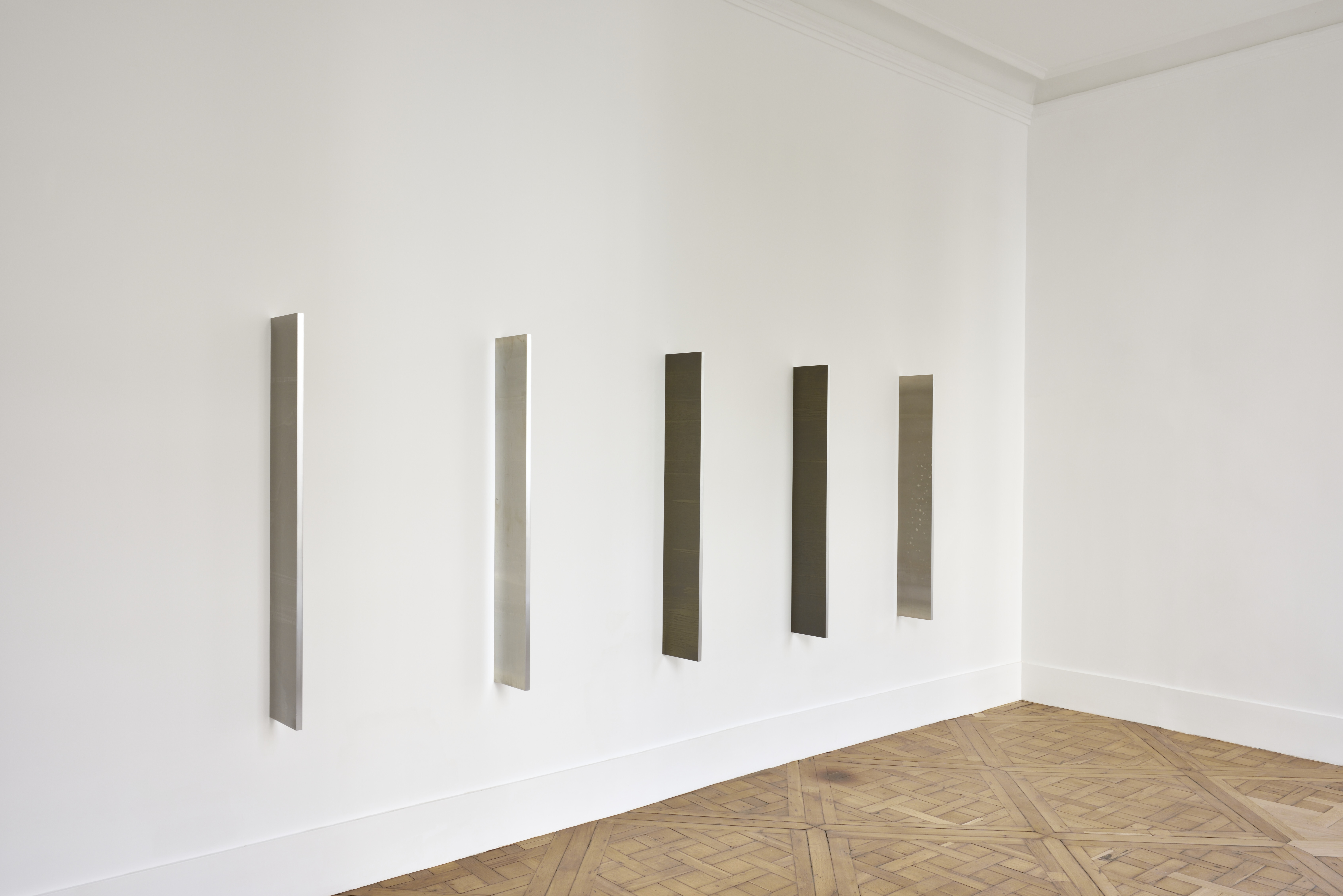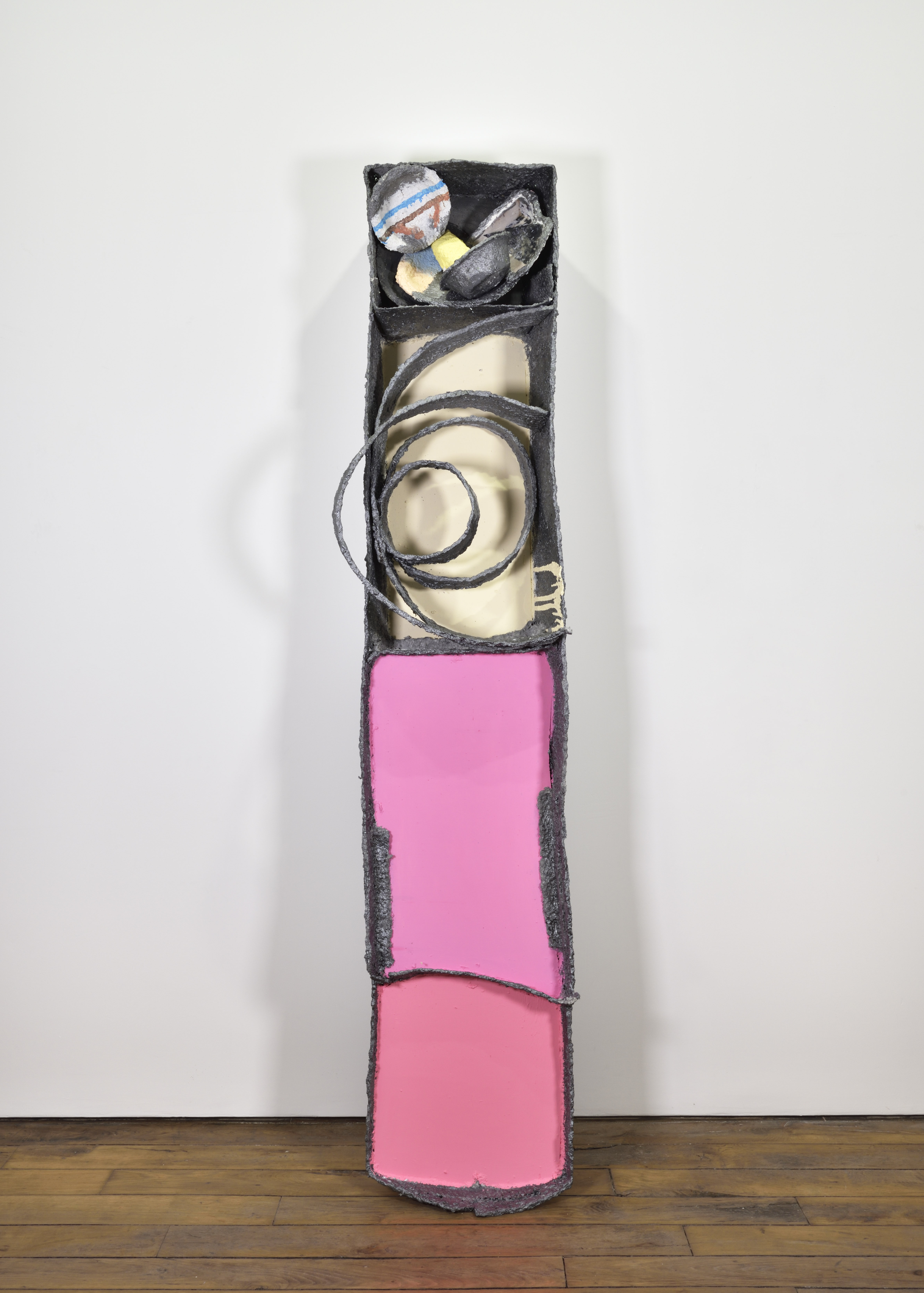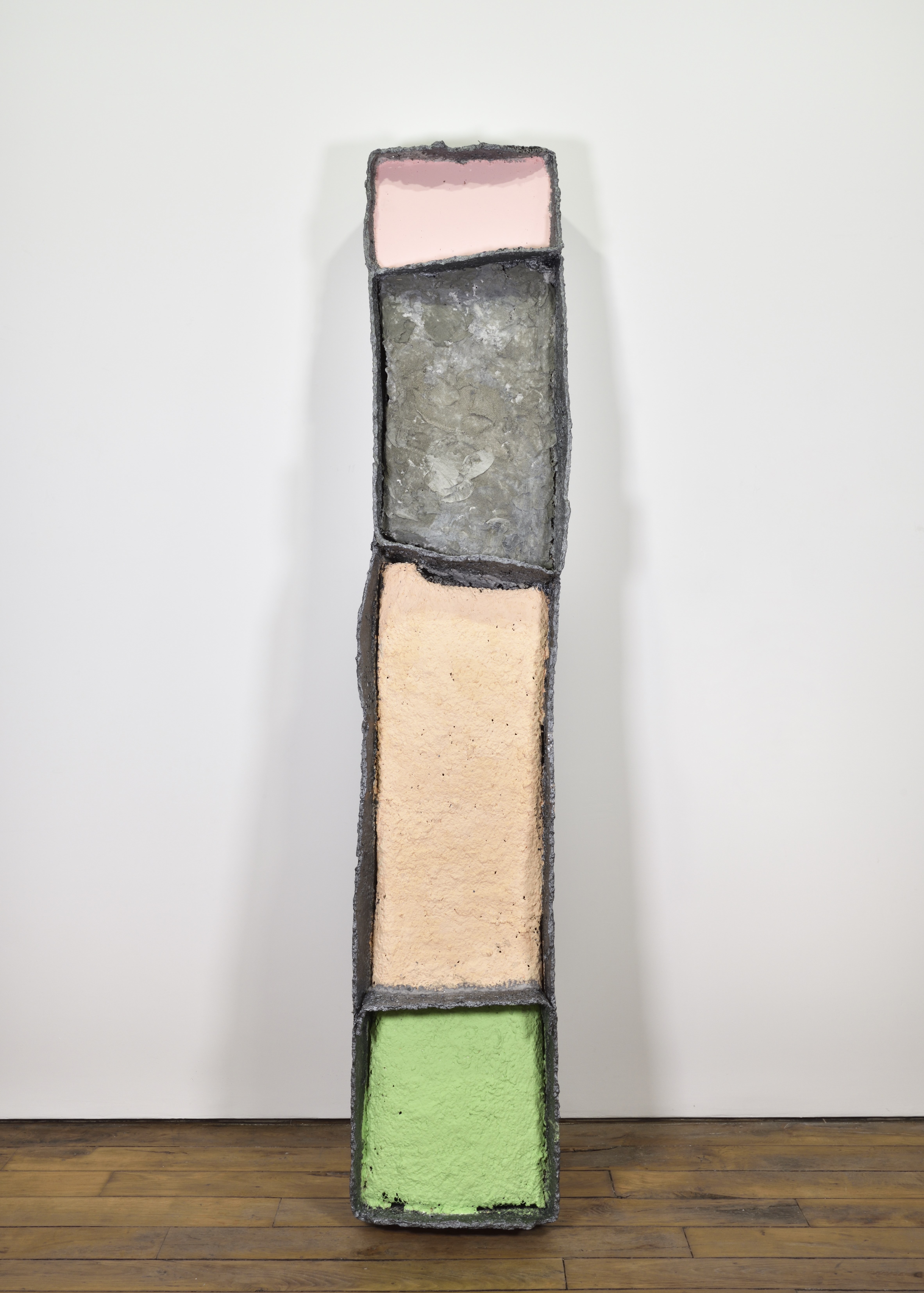 Kianja Strobert’s recent series of works presents the process, the raw material, the motivations and the goal simultaneously, devoid of any hierarchy. Strobert’s troughs filled with color are made with papier mâché covered by a painting evoking pewter, a metal primarily used for decorative metal items and tableware in ancient times. The work shares the context of other products of consumption,suggested by the repetition of utensils, objects and themes. Strobert’s works propose an attitude toward finish, in which the painter does not disguise the means of arriving at the final work.