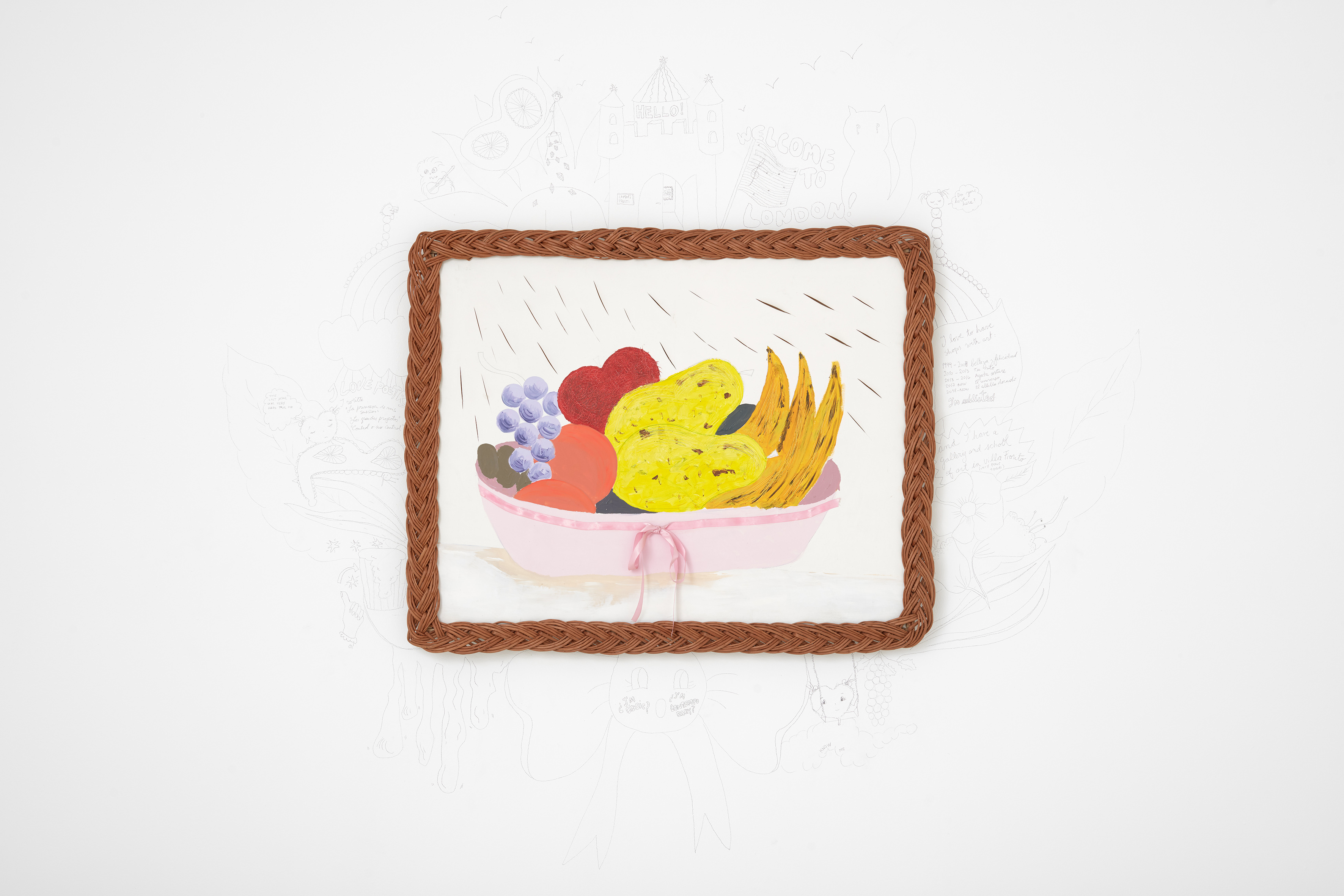 Acrylic on canvas and collage on wicker frame