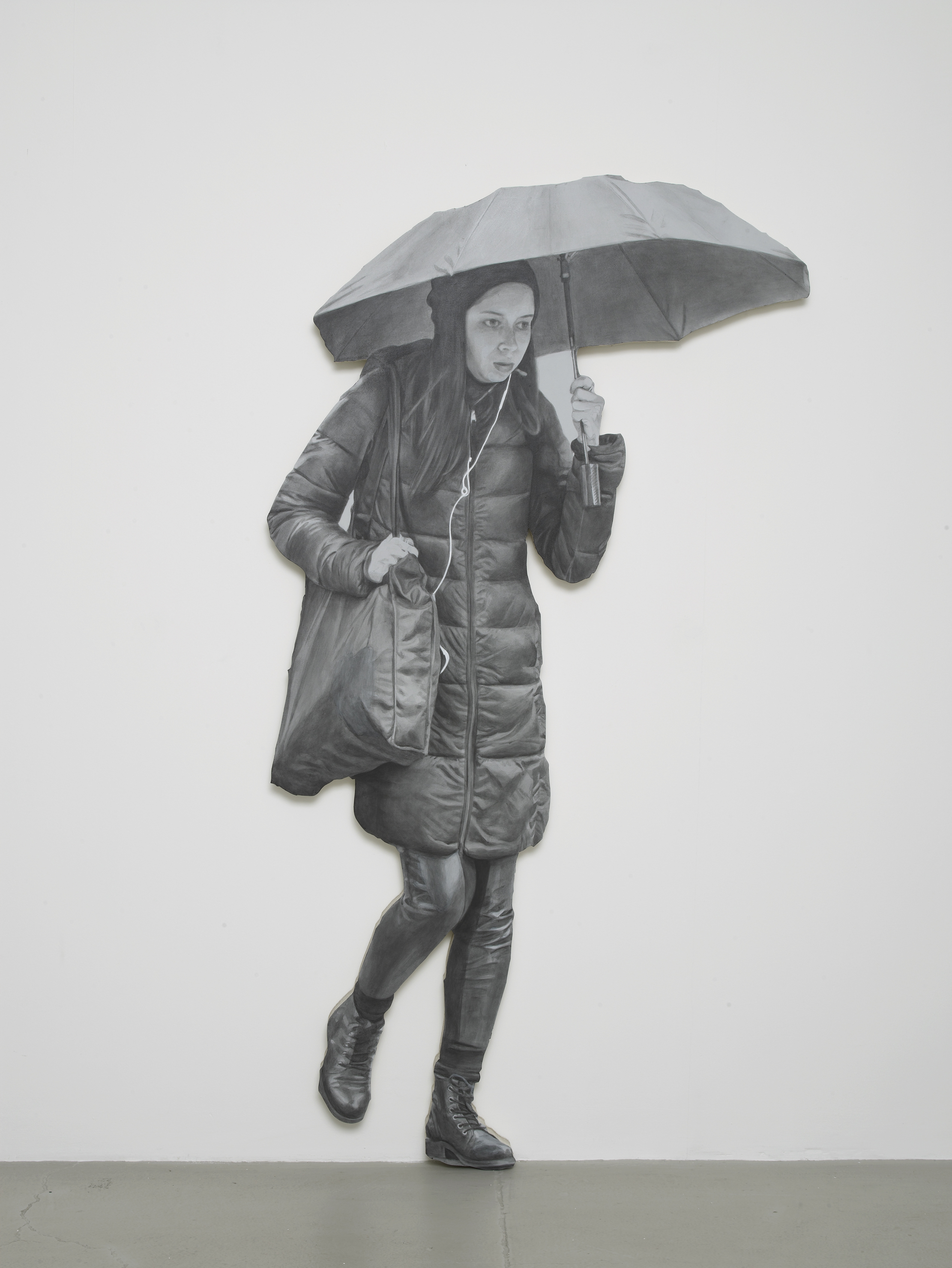 EnquireIn the Pedestrian series, the transition goes from photography to painting, which accounts for the fracture between spontaneity and labour. Their shapes as cut out tableaux reinforce the aspect of realism. In conjunction with this, Miller deploys a particular grisaille technique in which he mixes a fair amount of grey into all the colours. By reducing the range of values ordinarily fo und in realist painting, this palette imposes a limit on the realist effect and puts the rendering involved at one remove.