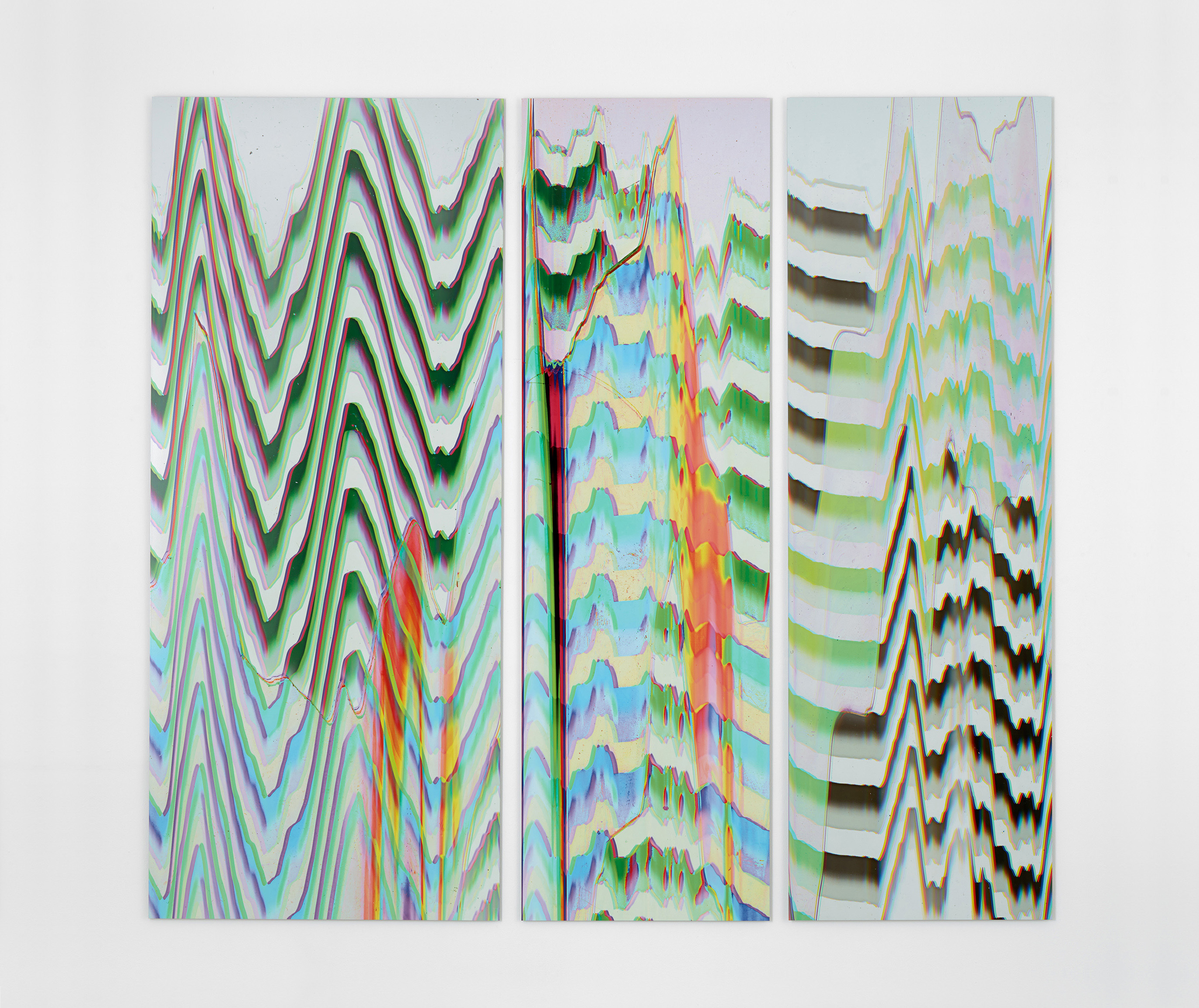 Throughout his career, Daniel Lefcourt has continually engaged the space between painting and technical imaging. The Terraform series conveys the impression of abstract landscapes seen from an aerial perspective. The works continue the artist’s exploration of painting in relation to technical and scientific imaging. An important reference for Lefcourt’s landscapes was the recording of the first image of Mars by Nasa scientists in 1965. The initial planetary image was taken by a satellite and transmitted to Earth as a numerical sequence representing varying tonal intensities.