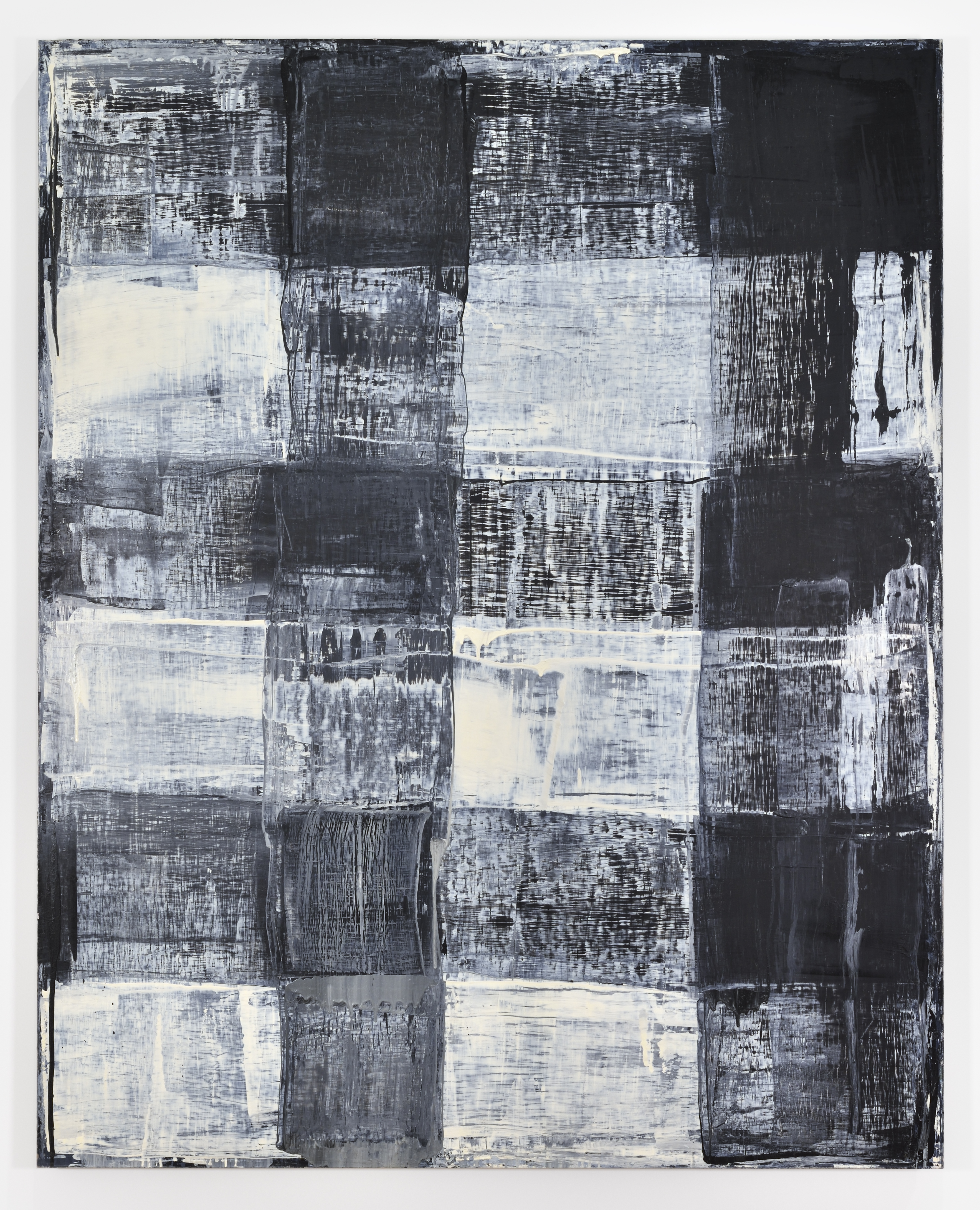 Cheyney Thompson’s work methodically deconstructs how painting is created, often imposing on his practice a set of constraints that involve mathematical formulas, protocols of observation and other orders of abstraction. His series of Displacement paintings posits each canvas’s ground as a touch-sensitive surface. The works adopt a uniform structure of fivemillimeter square black marks painted in a gridded pattern atop a white ground. Before the paint is dry, Thompson deploys an assortment of custom silicone tools against the surface, forcing the wet squares out of place. He adds no new material, but rather subjects the existing marks to this process of reorganisation. The resulting transformations appear as extensions of squares into lines, glyph-like forms, and sweeping, sinuous fields of paint.